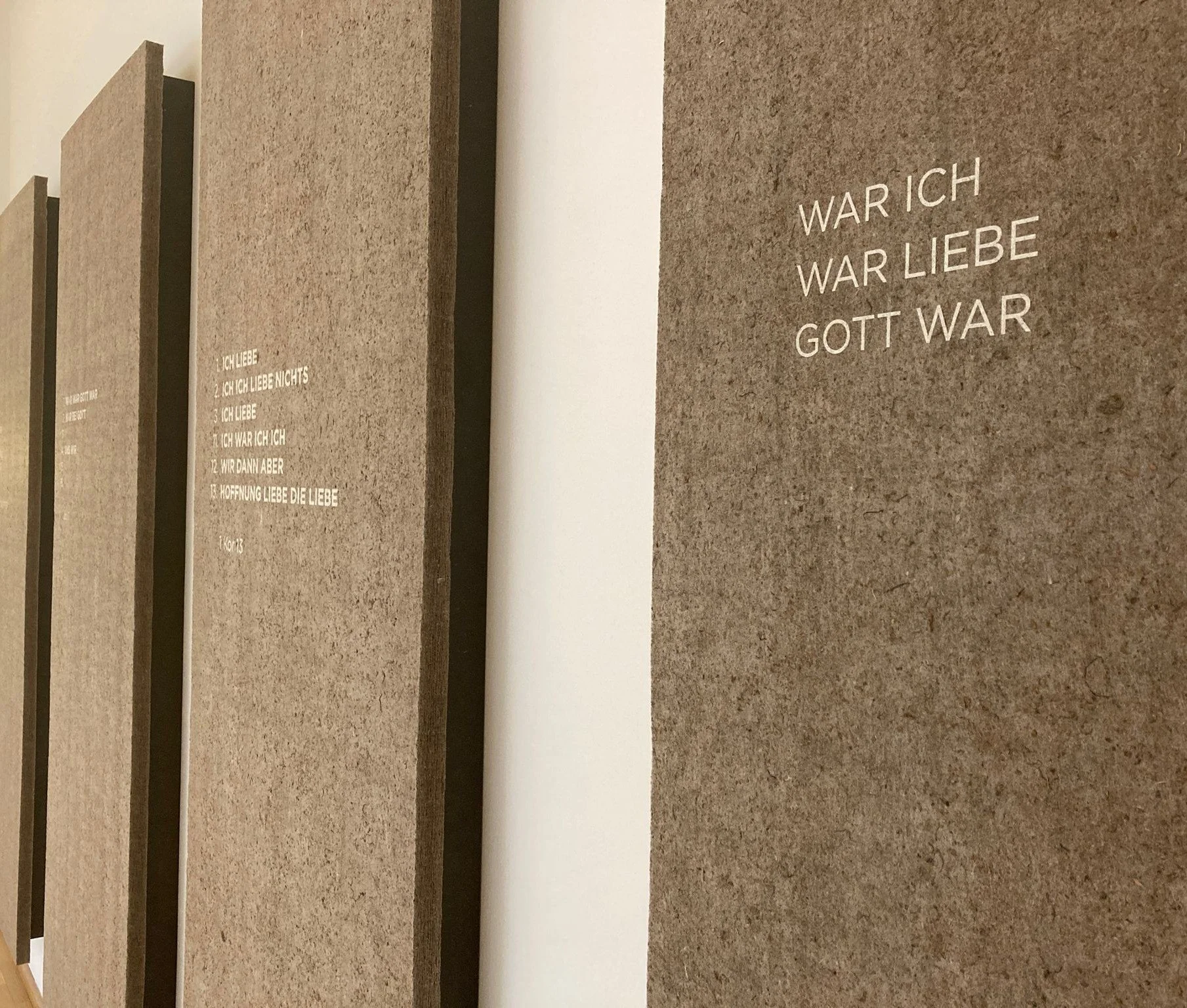 Für die Diözese Innsbruck wurde die gestalterische Neuausrichtung des Mehrzwecksaals übernommen und dabei Kunst, Funktionalität und Raumwirkung in Einklang gebracht. Ausgangspunkt waren Texte der Künstler:innen Franz Wassermann und Siljarosa Schletterer, die auf großformatige Naturfaserplatten übertragen wurden. Diese Elemente sollten nicht nur künstlerisch wirken, sondern gleichzeitig die akustische Qualität des Raumes deutlich verbessern.